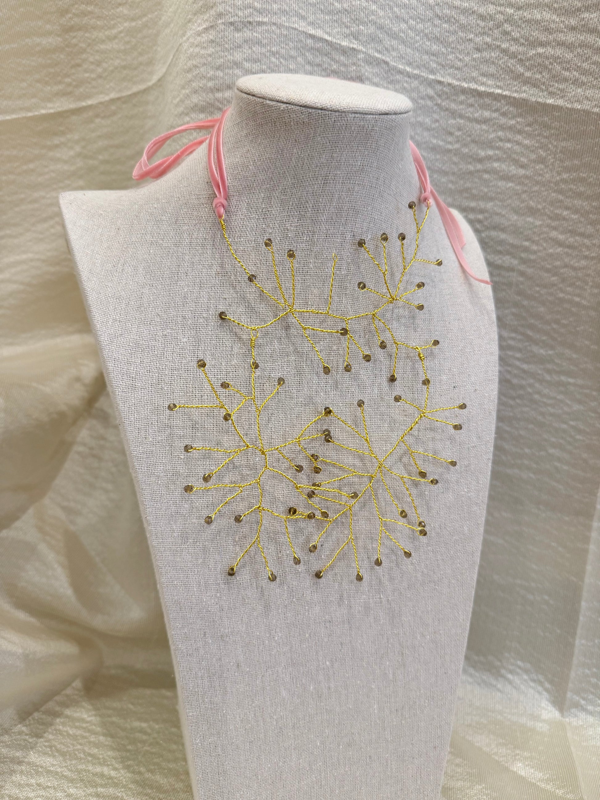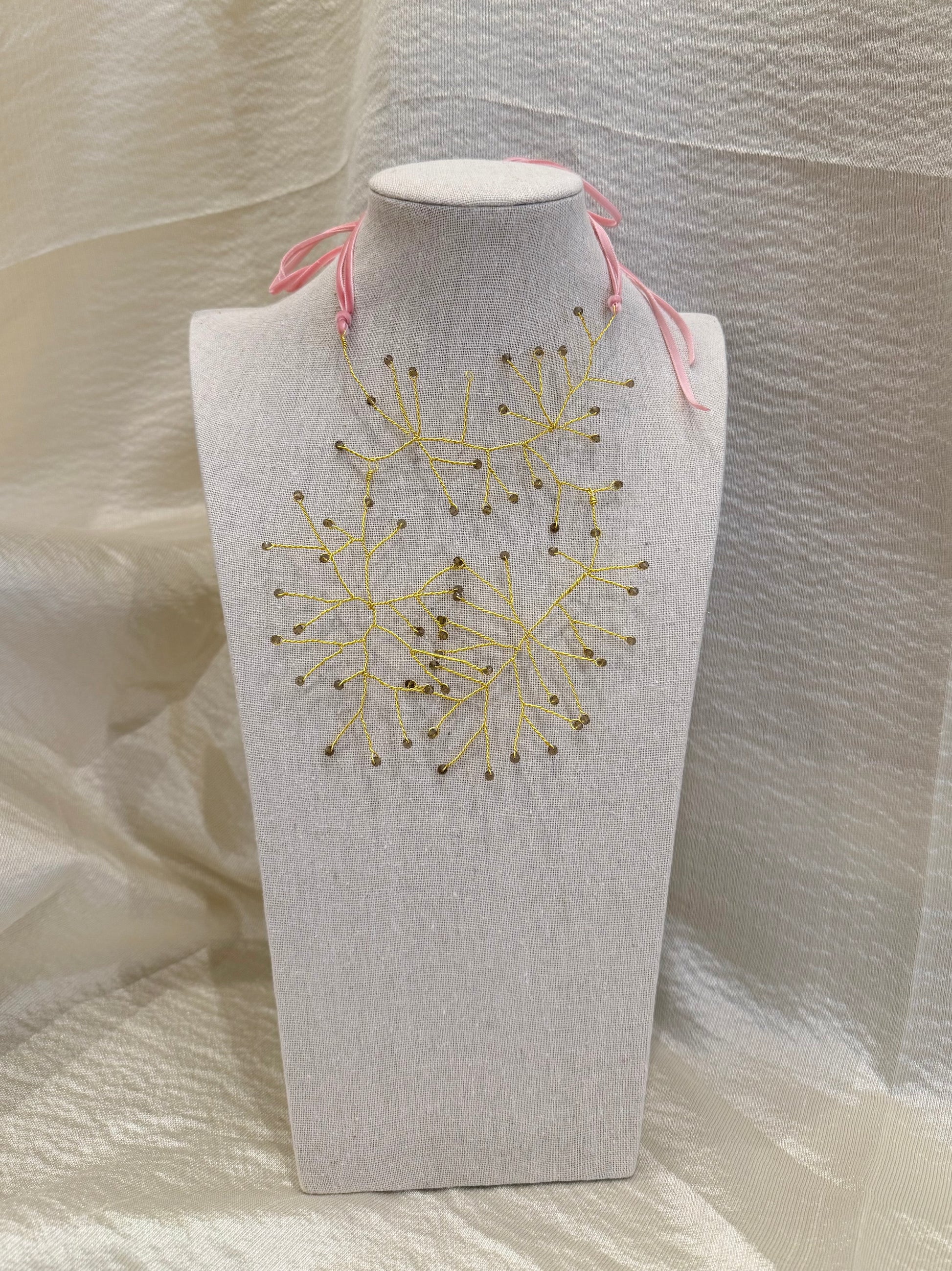 Collar de ramas de acero con cuentas de cristal gris y doble cinta trasera de terciopelo rosa