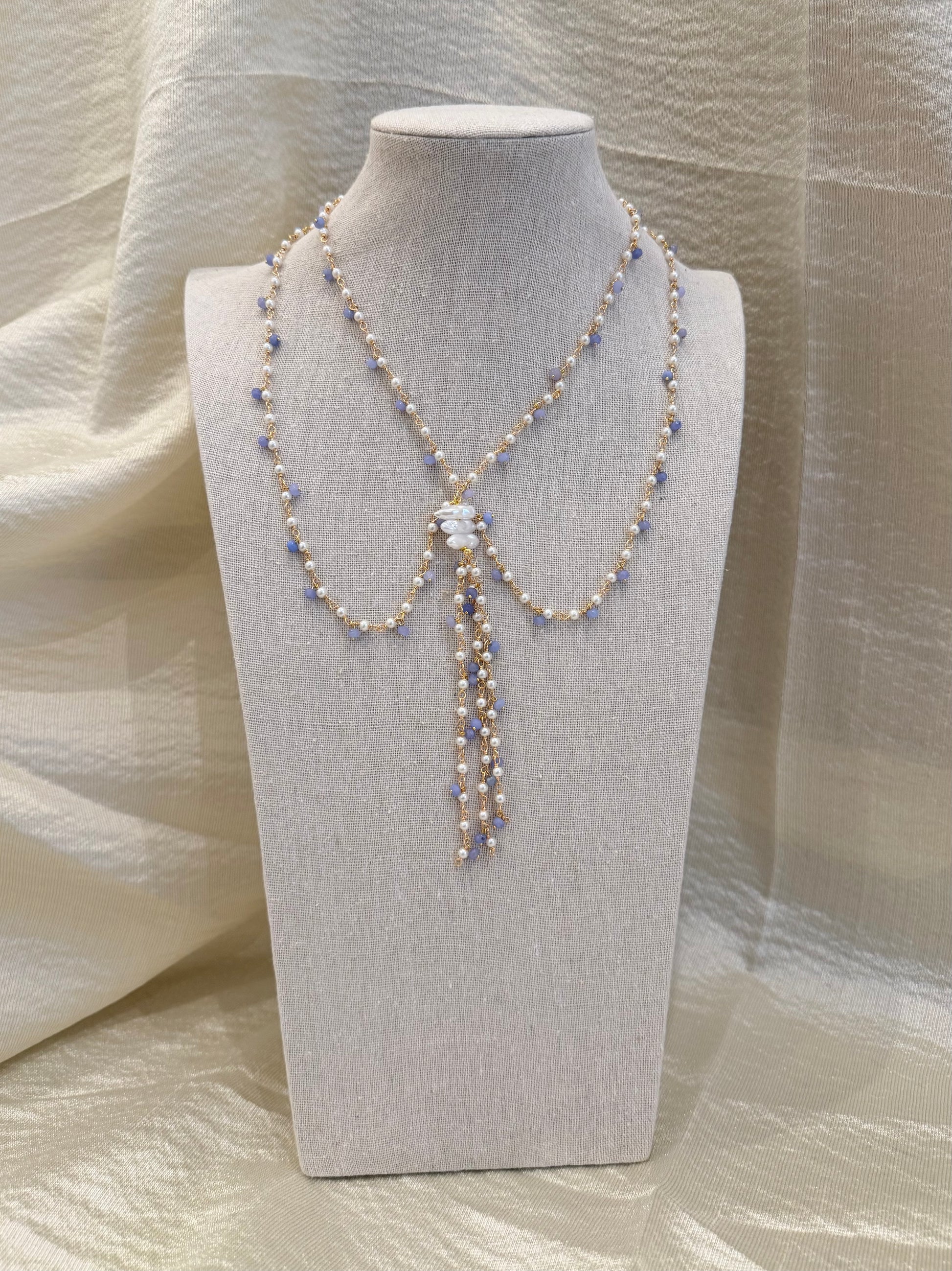 Collar de cadena de perlas y bolitas azules y perlas en el centro